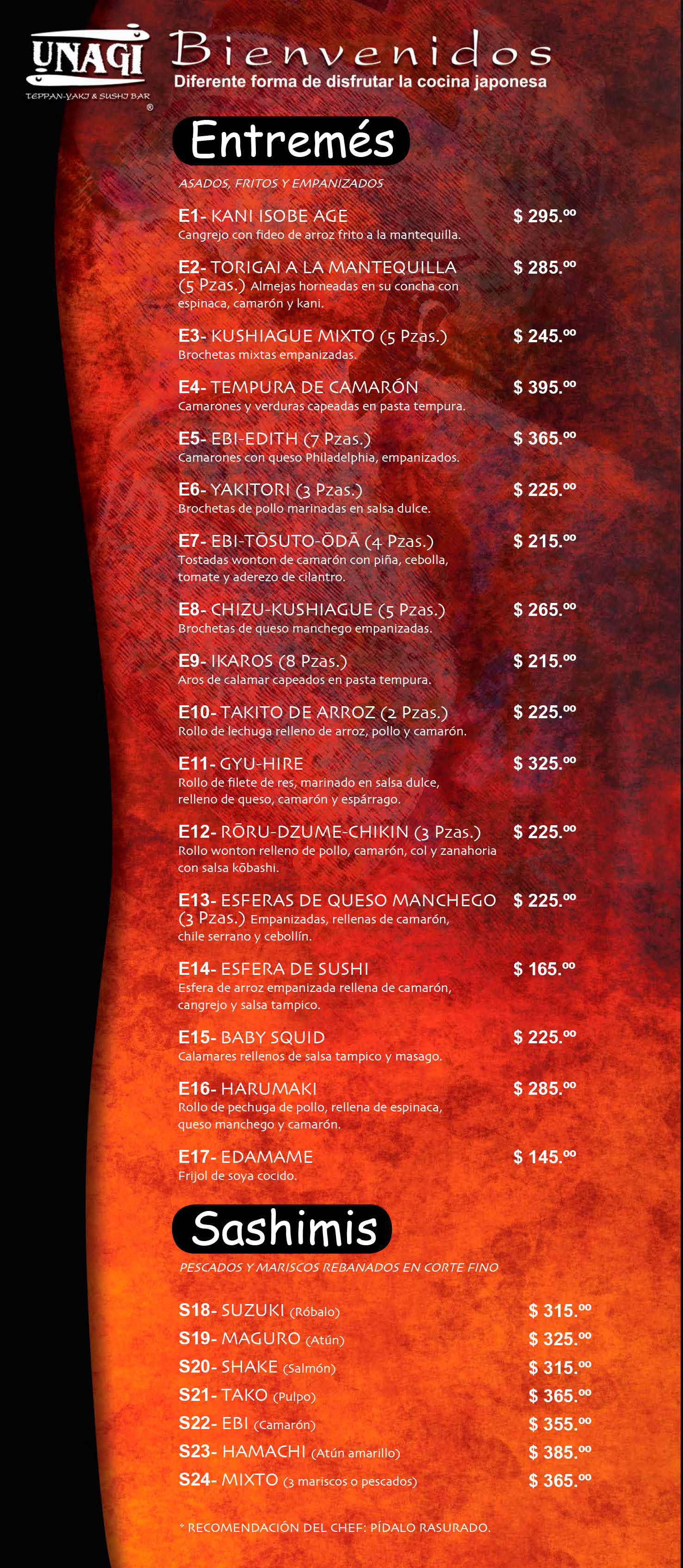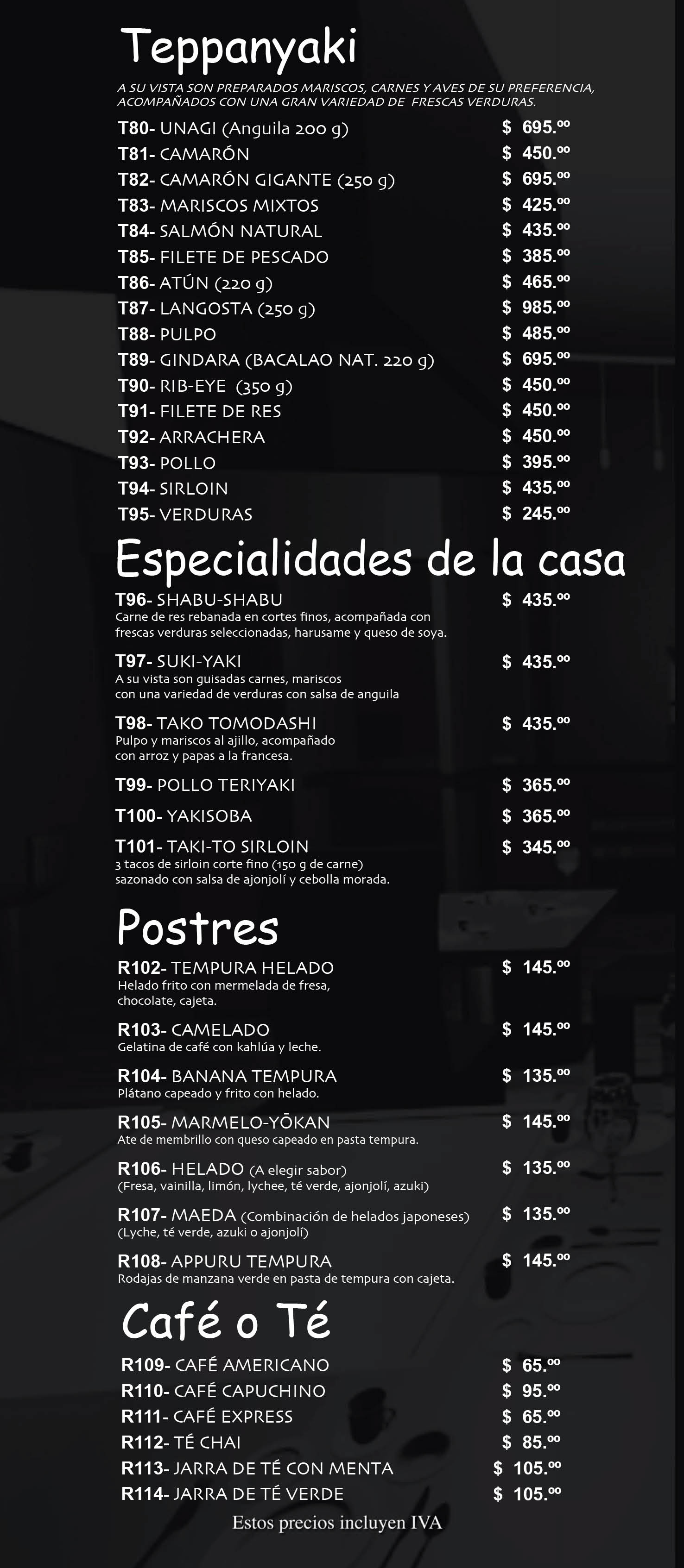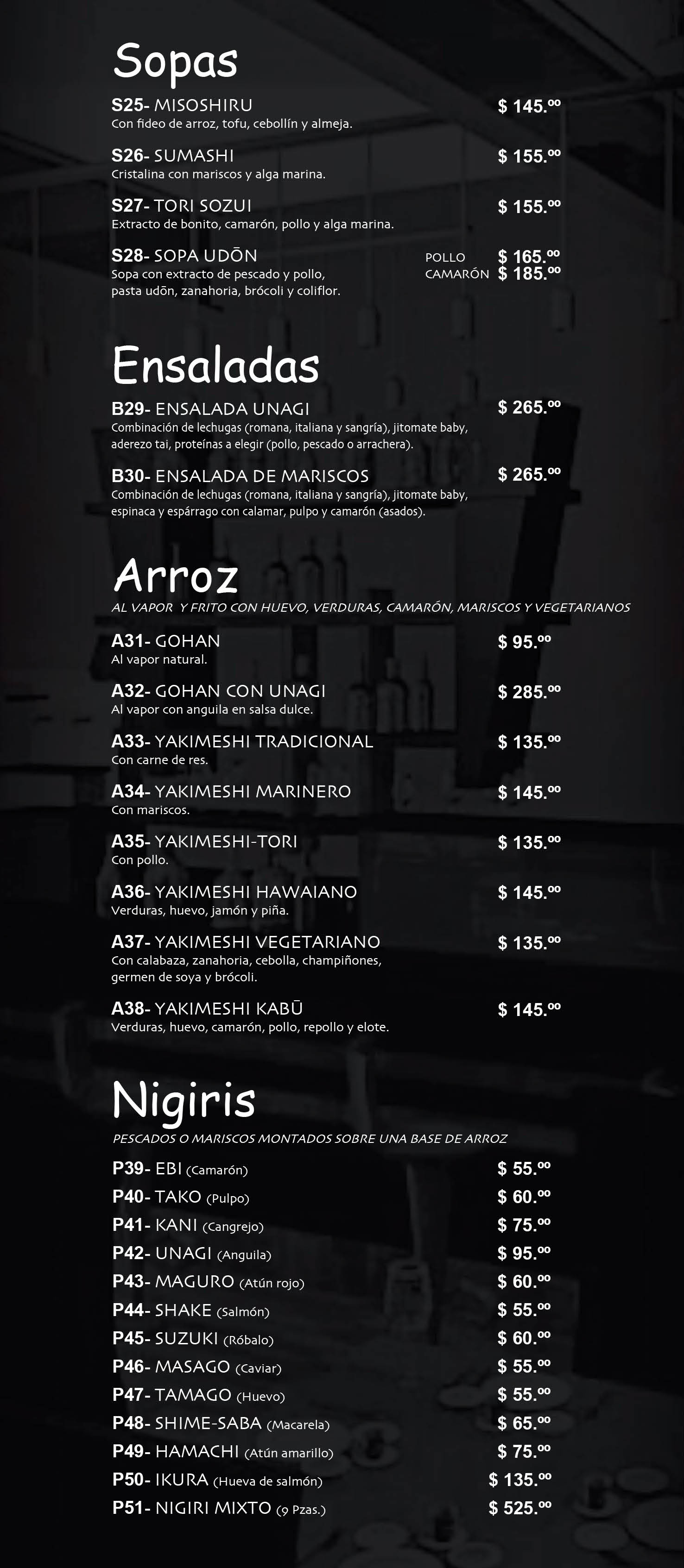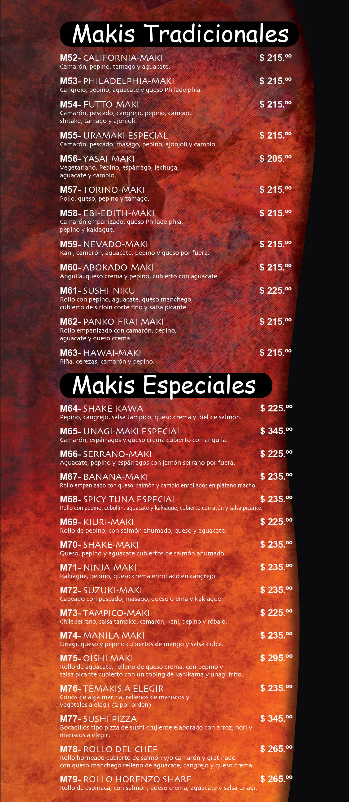 Somos un restaurante especializado en comida japonesa, entre nuestros principales platillos están el sushi : sushi, rolls, sashimis, nigiris, makis, teppanyaki, ensaladas, arroz, entre otros. Nuestra cocina se caracteriza por platos saludables, balanceados, con dedicación, orden y presentación acorde a lo acostumbrado por la cultura japonesa. Preparados con ingredientes frescos como: verduras, pescado, mariscos, arroz y muchos ingredientes más de la mejor calidad.